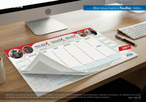 Calendrier sous-main en bloc de 25 feuilles détachables, au format 34 x 48 cm, entièrement personnalisé pour répondre à vos besoins. Ce calendrier est conçue
