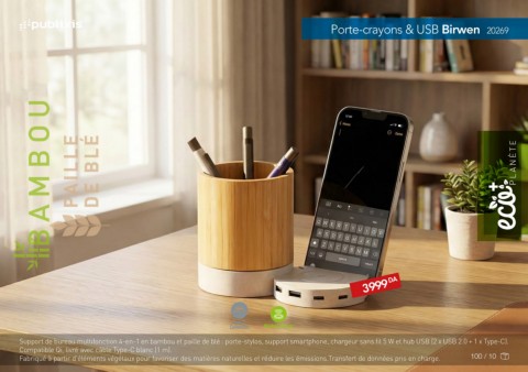 Support de bureau multifonction 4-en-1 en bambou et paille de blé : porte-stylos, support smartphone, chargeur sans fil 5 W et hub USB (2 x USB 2.0 + 1 x Type-C).