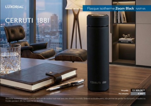 Bouteille isotherme signée Cerruti 1881 est de couleur noir mat avec des détails chromés. Grâce à sa double paroi, elle permet de garder les boissons, chaudes ou